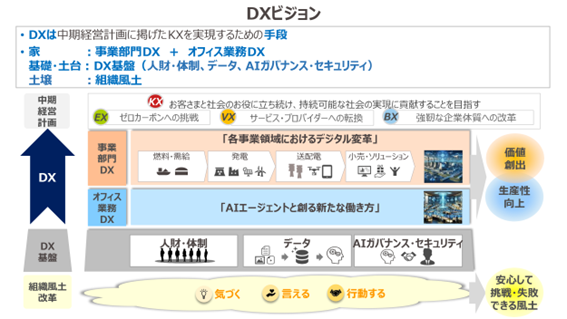 以下に、関西電力のDXビジョンを掲載します。家の構造に例えるならば、「家に当たるのが事業部門DX+オフィス業務DX」、「基礎・土台としてのDX基盤」「土壌としての組織風土改革」を全体的に進めながら、中期経営計画の実現を目指しています。