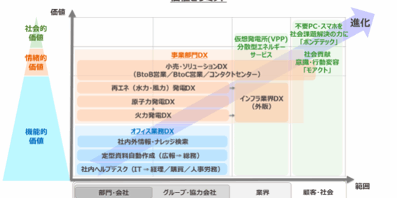 この図のように価値ピラミッドは、「機能的価値」「情緒的価値」「社会的価値」の3層から成ります。機能的価値は機能・品質やコスト・時間・労力削減などで、DXでは主にオフィス業務DXの推進により価値提供されます。情緒的価値は信頼の蓄積や不安軽減、物語性、面白さといった感情に訴求するもの、社会的価値は社会貢献、自己実現や他者への奉仕といった社会的な価値です。このように考えると、他社との差別化を図り競争優位を築くには、機能的価値だけでなく情緒的価値や社会的価値へといかに価値向上できるかと、価値提供の範囲を、社内やグループ会社に閉じるのではなく、業界や顧客・社会全体まで広げることが重要だということが分かります。