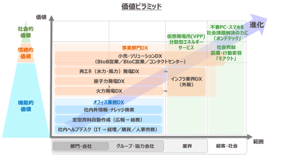 一方、3の「顧客にとっての価値は何か?」にも顧客という言葉が出てきます。私は「価値」という言葉を使うとき、いつも「価値ピラミッド」を思い浮かべるようにしています。価値ピラミッドの具体例として、私が現在携わっている関西電力のDX推進で提供できる価値を取り上げます。