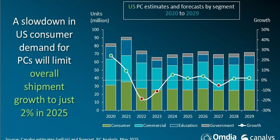 카날리스(Canalys)가 ‘2025년 1분기 미국 PC 시장 전망’을 발표했다. 2025년 1분기 미국 PC 시장(데스크톱 & 노트북)의 출하량은 2024년 1분기와 비교할 때 15% 증가한 것으로 나타났다. 하지만 2025년 전체 출하량은 앞에서 언급한 2% 증가에 그치고, 2026년 성장률도 4%에 머물 것으로 예상했다.