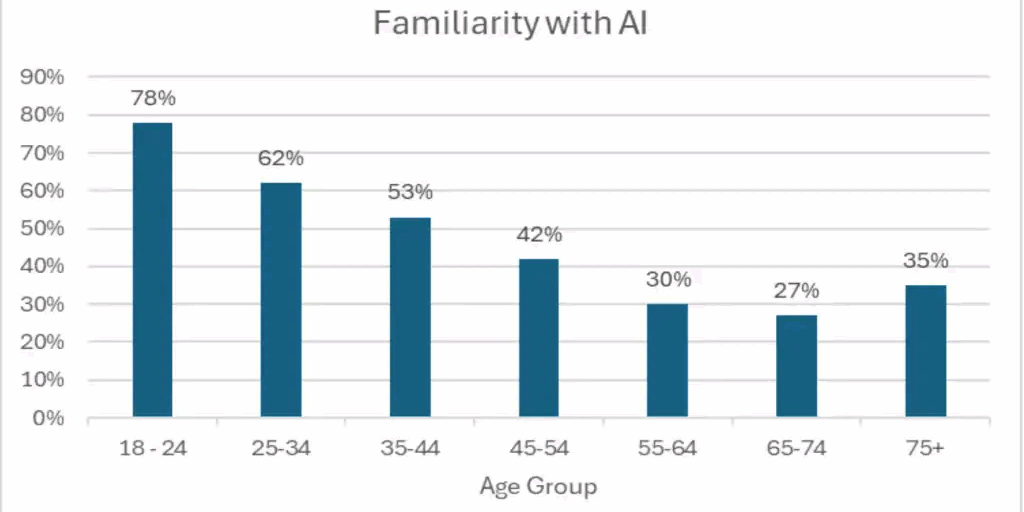 토론토 메트로폴리탄 대학교(Toronto Metropolitan University, TMU)의 연구에 따르면 생성형 AI에 대한 친숙도는 젊은 연령층에서 가장 높게 나타났다. 연령이 높아질수록 업무 환경에서 생성형 AI 도구에 대한 친숙도는 크게 떨어지는 것으로 분석됐다.