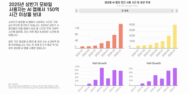 조사에 의하면 소비자가 생성형 AI 앱에서 소비하는 시간도 기하급수적으로 증가하고 있다. 2025년 상반기 사용자들이 이들 앱에서 보낸 총 시간은 156억 시간에 달하며, 이는 하루 평균 8600만 시간에 해당한다. 같은 기간 생성형 AI 앱의 총 세션 수는 4260억 회에 이르렀다. 이는 전 세계 인구가 평균 약 50회씩 생성형 AI 앱을 사용했다는 의미다.