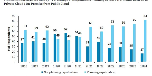 따라서 계획을 측정하기보다는 실제로 워크로드가 어디로 이동하는지 확인하는 것이 바람직하다. 동일한 바클레이스 CIO 설문조사에 따르면 그 답은 클라우드다.