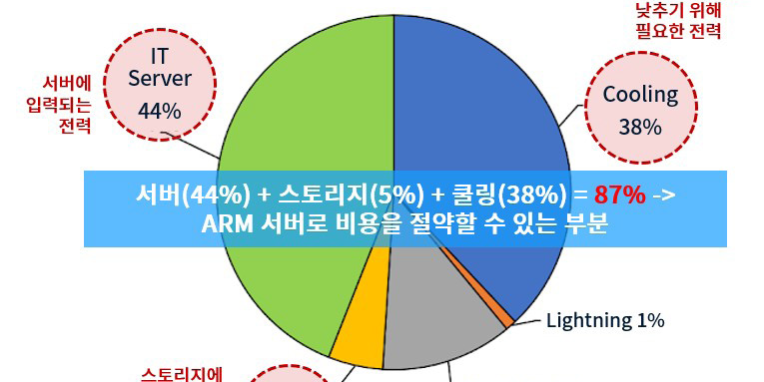 이 문제를 살펴보기 전에 우선 데이터센터에서 전력이 어디에서 소모되고 있는지부터 파악해야 한다. 데이터센터의 에너지 소비 구성을 살펴보면, 일단 서버 자체에서 사용하는 전력 비용도 크지만 서버의 발열을 낮추기 위한 냉각에 50% 가까운 전력 비용이 들어간다. 기존 서버 중 다수를 이루는 x86서버의 경우 발열량이 크다는 점이 한 이유다.
