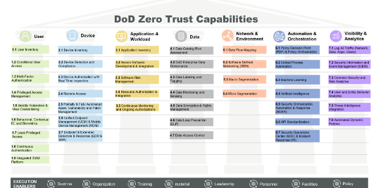 As depicted in Figure 1, the DoD developed an implementation roadmap5 by breaking down the seven pillars of the Zero Trust reference architecture into 45 capabilities. Each capability is further divided and organized into 152 Zero Trust activities.