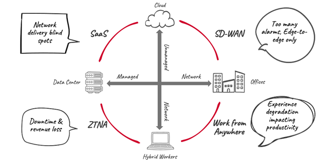 Public cloud services are popular because they offer organizations flexibility, lower costs, and more rapid deployments. But these services present entirely different traffic patterns than those of the past. The reliance upon external, third-party networks presents significant blind spots. This results in lengthy troubleshooting times, increased operations costs, and greater risk of user experience issues.