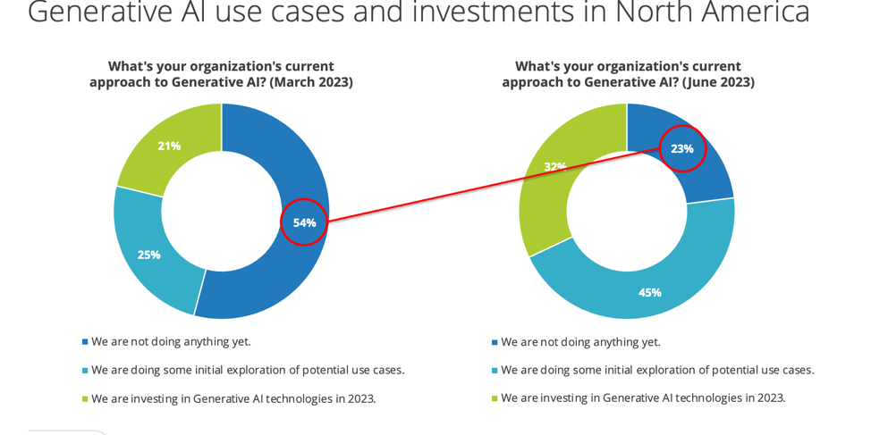 According to IDC, CIOs have gotten off the sidelines and are now getting out in front of the parade. In March 2023, 54% said they were not yet doing anything with regard to