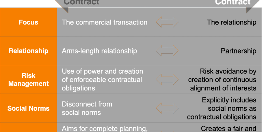 Relational contracts obligate the contracting parties to create a flexible framework to promote a fair and balanced exchange that accounts for the understanding that business is dynamic and things will change.